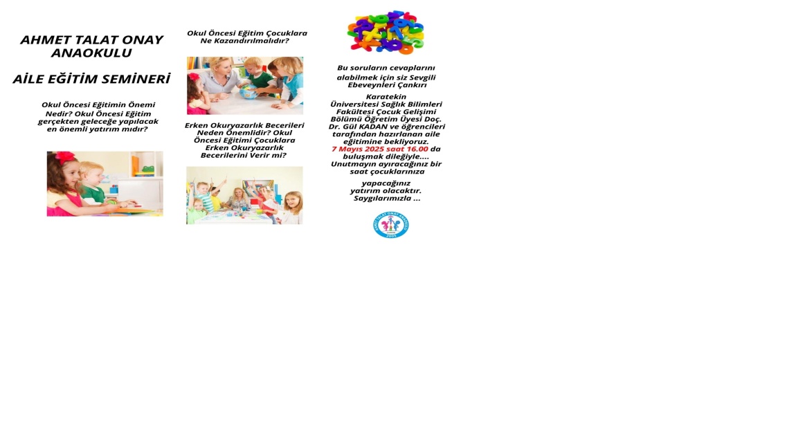 KARATEKİN ÜNİVERSİTESİ SAĞLIK BİLİMLERİ FAKÜLTESİ ÇOCUK GELİŞİMİ BÖLÜMÜ ÖĞRETİM ÜYESİ DOÇ. DR. GÜL KADAN VE ÖĞRENCİLERİ TARAFINDAN HAZIRLANAN AİLE EĞİTİMİNE 7.05 .2025 ÇARŞAMBA GÜNÜ TÜM VELİLERİMİZİ BEKLİYORUZ.